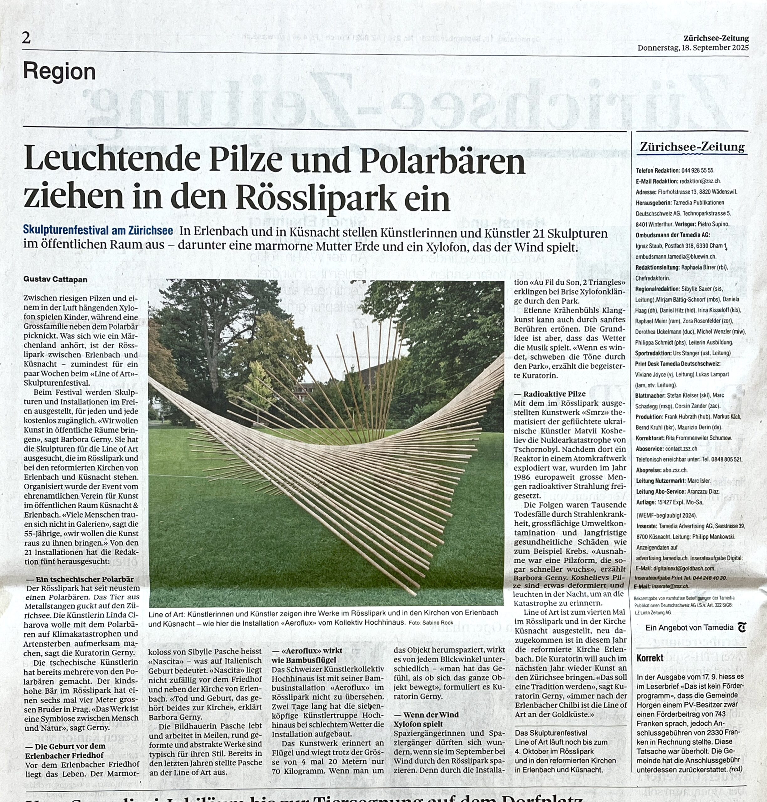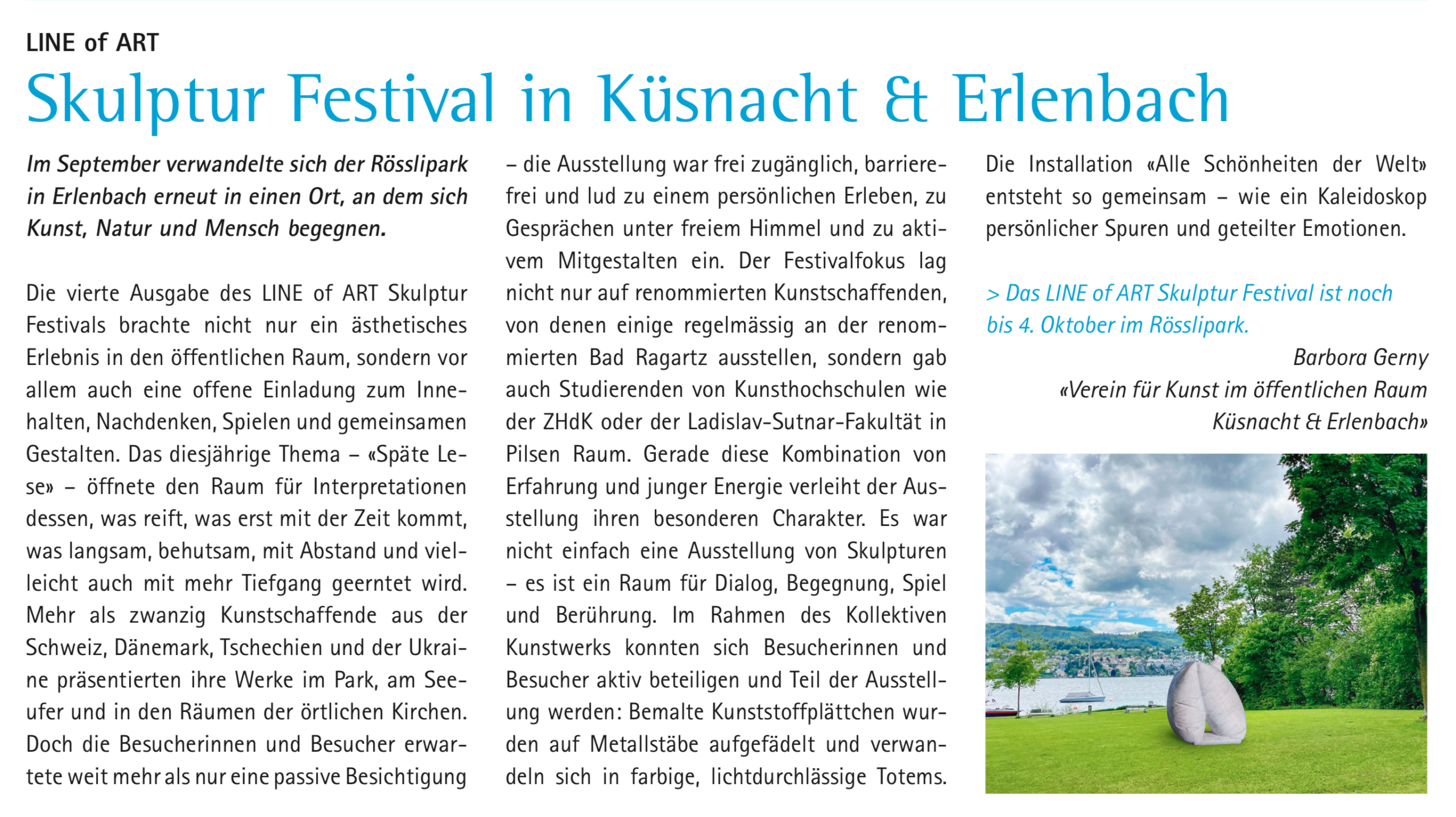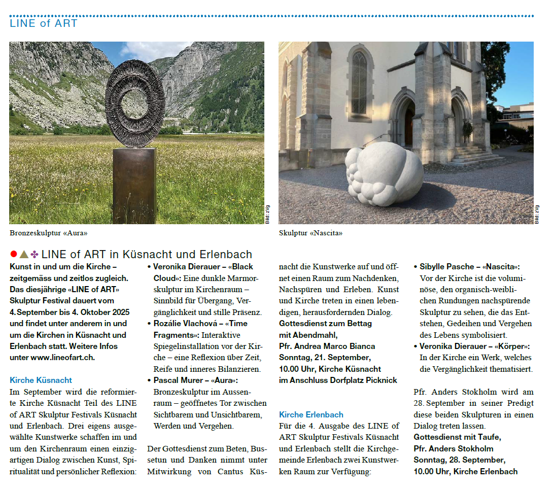 Dorthin, wo das Leben pulsiert, an den See, in den Park und auf die Strasse, bringt das LINE of ART Skulptur Festival Skulpturen und Installationen. Kunst wird so zu einem verbindenden Element, das Begegnungen ermöglicht, zum Dialog einlädt und das kreative Potenzial eines Ortes sichtbar macht.