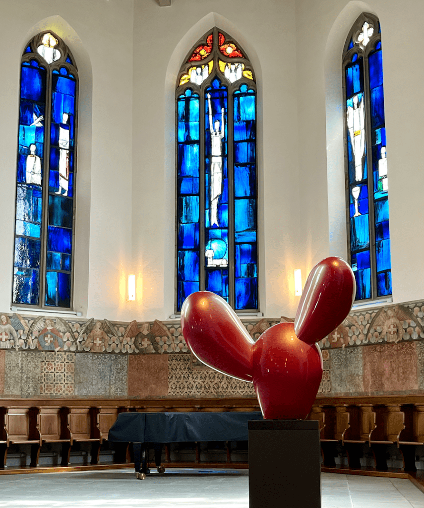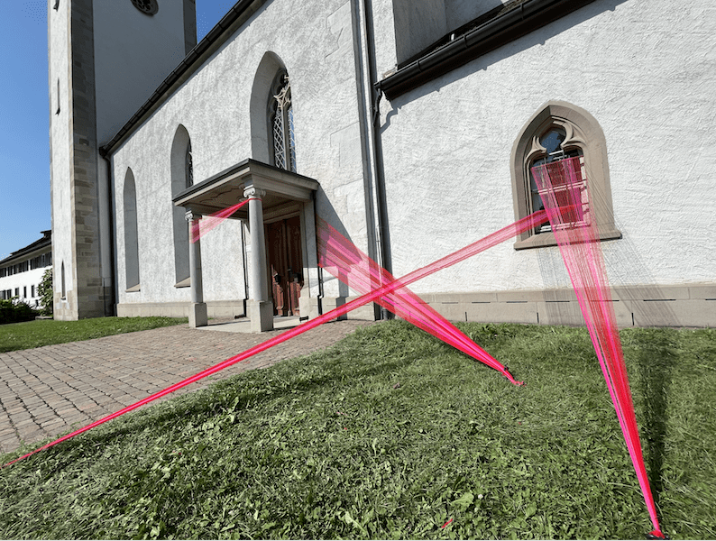 mit dem Team Ruth Joss, Annatina Simeon, Regina Staiger und Theo von Däniken Wollgarffiti2024Instalation Zart und zerbrechlich sind die Wollgraffiti. Sie verändern den Raum, sie dehnen sich aus, weben Orte, fein und filigran, wie die Spinnennetz, sie binden Bäume, Gebäude, Menschenschicksale zusammen.Bettina Baltensweiler und Anna-Flavia Barbier erzählen mit ihren Wollgraffiti Geschichten, intervenieren im öffentlichen Raum und nehmen oft Stellung zu politischen und gesellschaftlichen Themen.Der öffentliche Raum ist für sie der ideale Ort, um ihre Ansichten durch künstlerische Arbeit auszudrücken.Für die Ref. Kirche Küsnacht haben die beiden Künstler ein Projekt über den Dialog vorbereitet, der den sakralen Innenraum der Kirche mit der Aussenwelt verbindet. Genau diese Verflechtung symbolisiert den Dialog, zwischen Mensch und Mensch. Der sakrale Raum der Kirche öffnet sich in alle Richtungen, als ob jahrhundertealte Steinmauern verschwunden wären und ein offener Raum für den Austausch von Meinungen entstünde. Die rosa Fäden sind wie Worte, die sich in alle Richtungen ausbreiten. Sie durchkreuzen den Raum, sie wechseln Form und Meinung. Sie sind nur für einen Moment da, wie ein Gedanke, der in den Raum ausstrahlt und und auf Resonanz wartet.