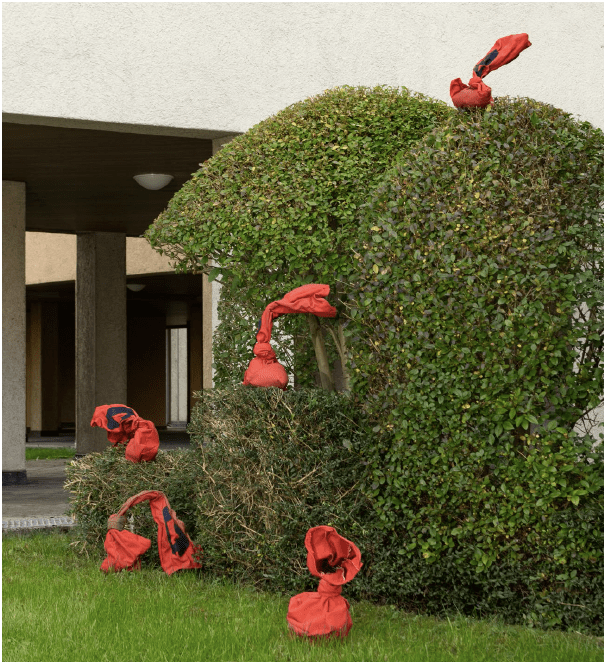 P.O.O.P (Propper.Organized.Oversized.Poop)Jahr: 2020Technik: Textilien genäht mit DrahteinlagenGrösse: höhe 80 cm, breite 25-60 cm, tiefe 25 cm Ausgangspunkt von P.O.O.P. ist eine fotografische Studie und einhergehende Beobachtung von Tüten, die es nicht in den Müll schaffen. Sie werden beim Aufsammeln von Hundekot verwendet, dabei zum Spaziergang mitgenommen, ausgepackt, benutzt und mit einem Knoten versehen. Damit möchte man einen Versuch des Entsorgens verstehen, ein Bewusstsein welches sich durch Inkonsequenz, schnell als die Entscheidung des Nicht-Entsorgens entpuppt. Hier entsteht ein Statement der Widersprüchlichkeit. Die Büsche der Stadt werden zu Displays der Tüten. Die Tüten werden Hochskaliert, im Verhältnis von Hunden zu Kunststudenten. Das Füllmaterial der Tüten sind die Exkremente, die als die unzähligen Produktionen innerhalb eines Kunststudiums gesehen werden können